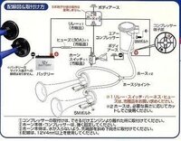 エアーホースの配管図 配線図:純正ホーンの配線が1本の場合 配線図:純正ホーンの配線が2本の場合 配線図:別スイッチで配線の場合 ホーンリレーの詳細とご購入はこちら ニッケン ホーンリレー24V用 NIK124A ニッケン ホーンリレー12V用 NIK112Aノーマルのホーンは右ヘッドライト近辺にあります♪ ネジ1本と配線二本で取り外し ! ヾ(^ ^ヾ) 交換ホーン! 交換ホーンは、永遠の定番 ! alpha ii !! 自分の車も歴代ほぼ全部これ ! 今の二台もこれです♪ 純正が1個ホーンに対してアルファーiiだと二個「回路図」 純正ホーン バッテリー 12v10a 車室内 純正ホーンが鳴っていない時は 12vが流れて来ています。 純正ホーンリレー ホーンボタンを押すとホーンリレー が働きこのラインはゼロvとなります。 12v0.5a